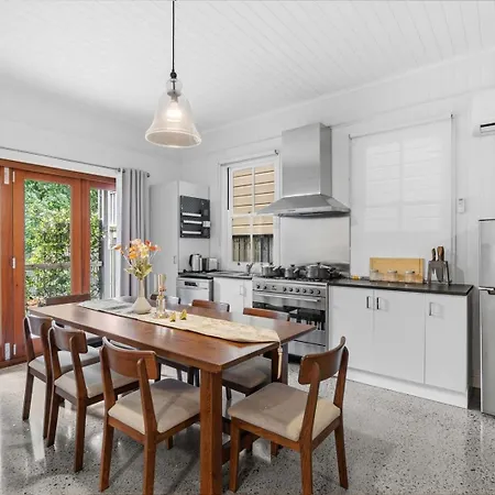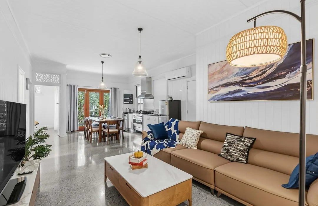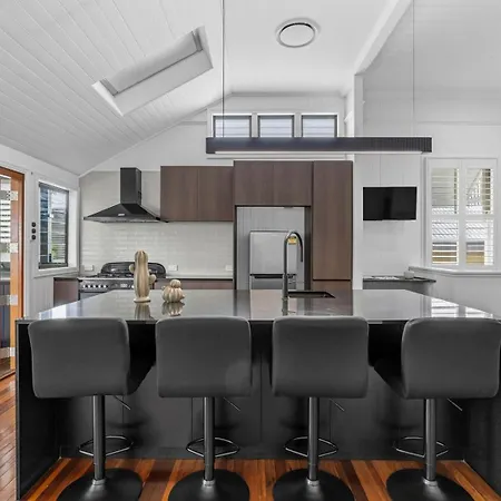 Situated only 1 km from the nickname Gabba, Elegant Dual-Level Home Near Cafes, Parks & River Brisbane invites guests to relax at a patio.