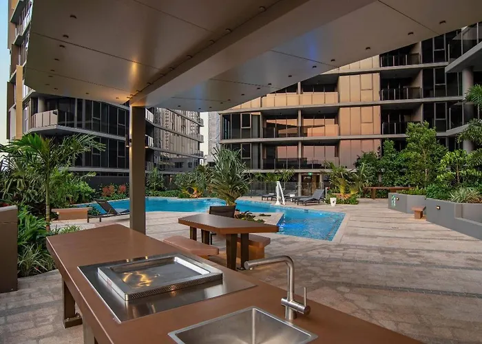 Brisbane CBDLocated just 1.6 km from The Brisbane River, the 50 m² Queens Wharf Luxe Retreat -Brisbane Cbd, Pool, Spa apartment features a rooftop pool with a pool fence. The apartment is within 25 minutes' walk…View details+More detailsCheck rates - The Star Complex Residence