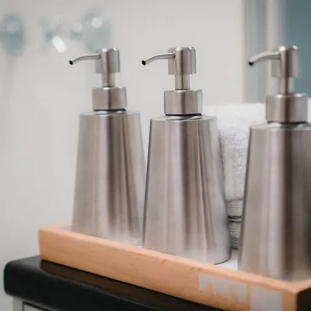 The apartment features a bathroom with hair dryers, toiletries, and bath sheets.